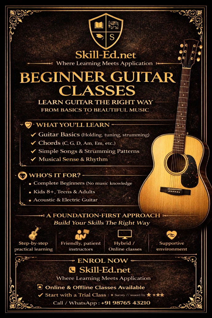 At Skill-Ed, our Beginner Guitar Program is designed for absolute beginners with no prior music knowledge. Whether youβre a student, teenager, or adult, we help you build a strong musical foundation through step-by-step, practical learning.